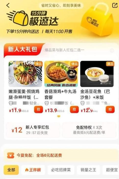 为了快,饭也变了样。极速达专区的饭都是标准化套餐,没法自定义,菜都是提前处理好的,有的甚至是预制菜。我问过一家店长,味道会不会差?他说:“能吃就行,关键是出得快。” 后厨24小时开工,闪电仓里连卫生巾、创可贴都备着,就为了30分钟内送到你手里。