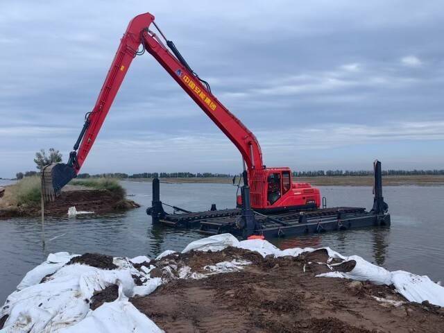 r该水陆两栖挖掘机适用于抗洪抢险与水上工程救援场景,具备船舶般的漂浮与自航能力,可直接在水面上作业。该设备浮力超60吨,航速达7公里/小时,并搭载智能化控制系统与远程遥控功能;采用伸缩式浮箱底盘,能快速自主上下运输车辆,显著提升转场效率。可配备铲斗、破碎锤、清淤泵等多种工具头,实现一机多能。